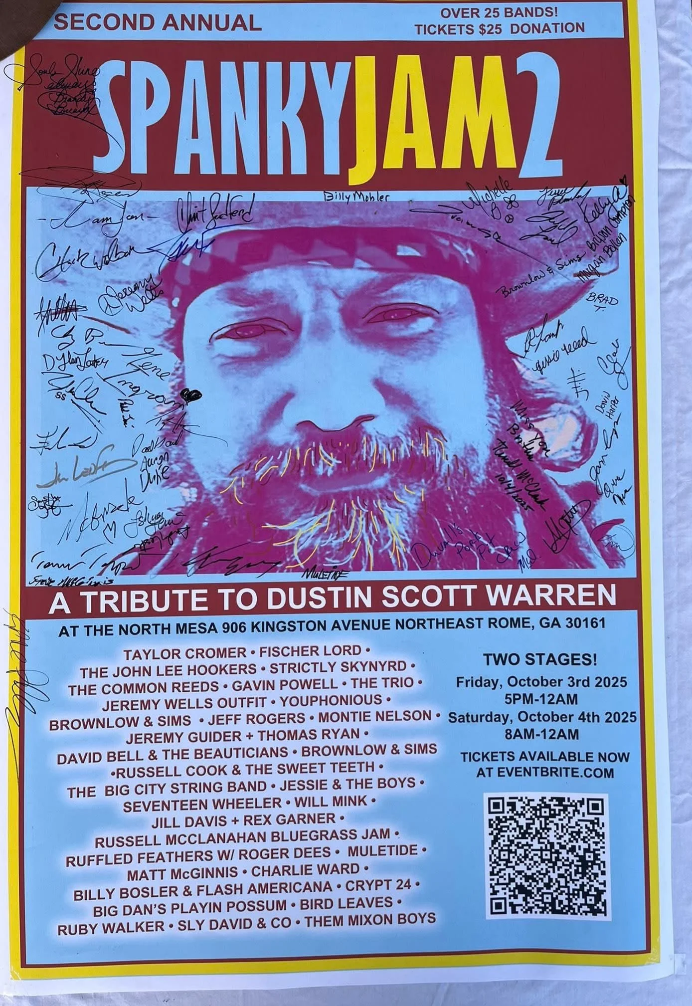 SPANKYJAM2, a tribute to Dustin Scott Warren, was held October 3rd and 4th, 2025 at the North Mesa. The event brought together amazing local musicians many of whom shared stories of how Scott had made an impact on there lives and music. The event also gained both volunteers and instruments for the Music Library started in memory of Scott Warren.